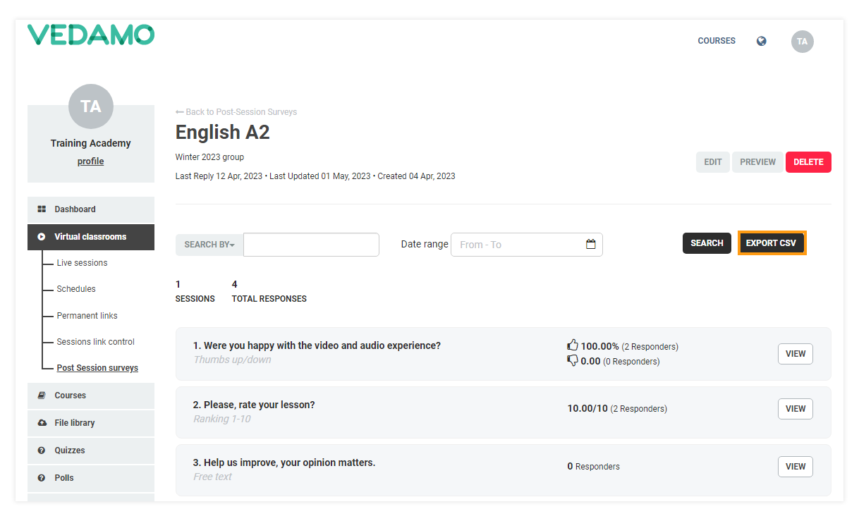 Post-session surveys: Location of the delete button How to download answers from custom surveys