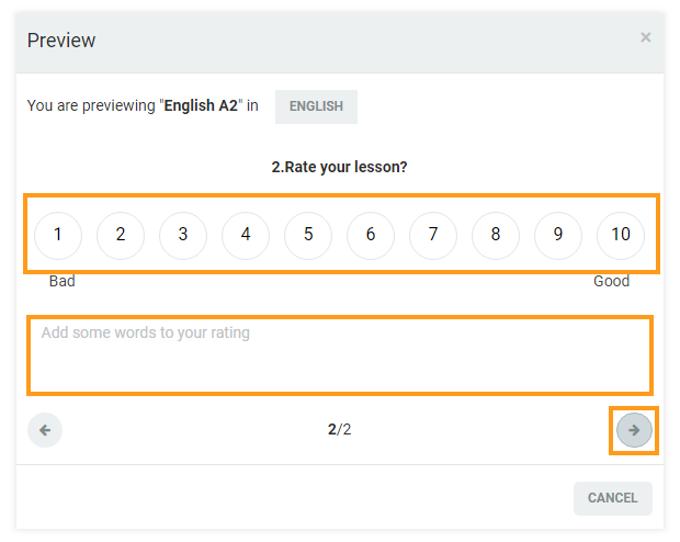 In the screenshot below you can see how it will look for the participants. They will have an option to select from 0-10, and a free text box to add on why they have chosen the specific number.