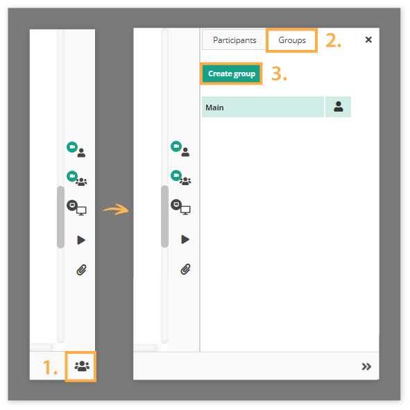 Groups (also known as breakout rooms) are separate workspaces in the room. Each one has its own separate room elements: video conference connection, online whiteboard, chat, media player, and participant controls – available only for the participants added to the group.