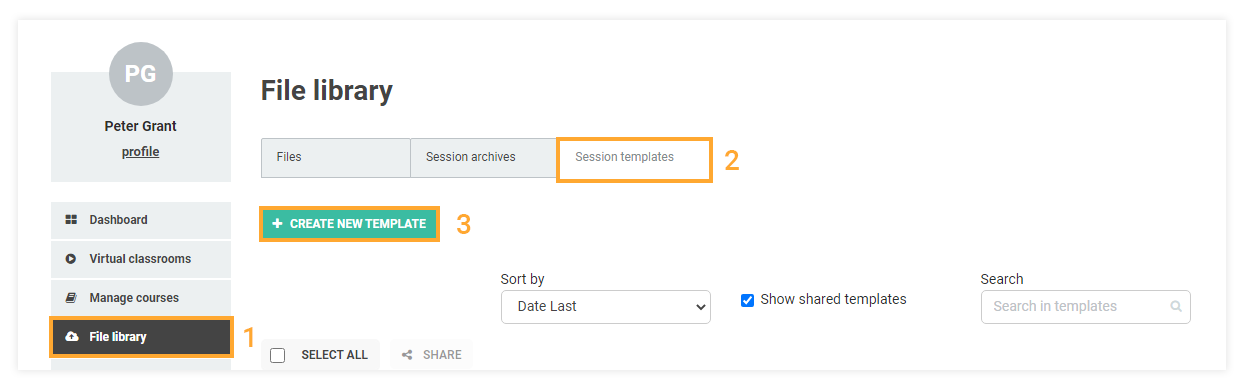 Click on the three dots sign and then press “Session templates” to view the list of the virtual classroom templates: